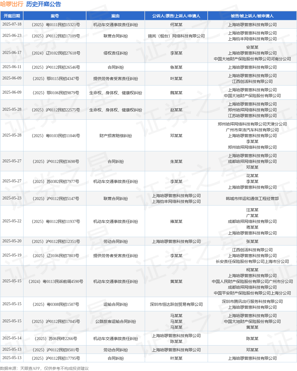 案号:(2025)苏06民终2266号审理法院:江苏省南通市中级人民法院案由:机动车交通事故责任纠纷当事人信息: 原告/上诉人:上海哈啰普惠科技有限公司、陈某某 被告/被上诉人:陈某某开庭日期:2025年5月14日根据统计,近一年内以上海哈啰普惠科技有限公司为当事人的历史开庭公告有272则,其中案由为“机动车交通事故责任纠纷”的公告以84则居首,其次为“合同纠纷”有37则,“生命权、身体权、健康权纠纷”有20则。历史开庭公告(前20条)如下: